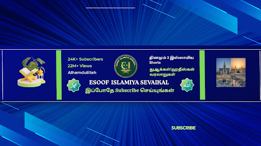 "அஸ்ஸலாமு அலைக்கும். ESOOF ISLAMIYA SEVAIKAL சேனலுக்கு உங்களை வரவேற்கிறோம். எமது சேனலில் குர்ஆன் வசனங்கள், தினசரி துஆக்கள், மற்றும் நபிவழியில் (Sunnah) வாழ்வதற்கான எளிய ஆலோசனைகளைத் தமிழில் வழங்குகிறோம். மார்க்க அறிவைப் பெற்று, அல்லாஹ்வின் அருளை அடைய எமது சேனலை சப்ஸ்கிரைப் செய்யுங்கள்."