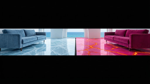 I create photorealistic luxury floor concepts that don't exist in real life - two visions competing in one room, split straight down the middle.
